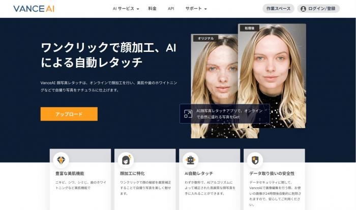 VanceAI顔写真レタッチはさきほどご紹介したVanceAI写真イラスト化と同じ会社が開発したWEBアプリです。こちらもAIを利用しており、ワンクリックで顔加工うやレタッチができるようになっています。