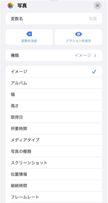 「写真を選択」と入力すると、「写真を選択」が表示されるので項目を押してアクションを追加します。