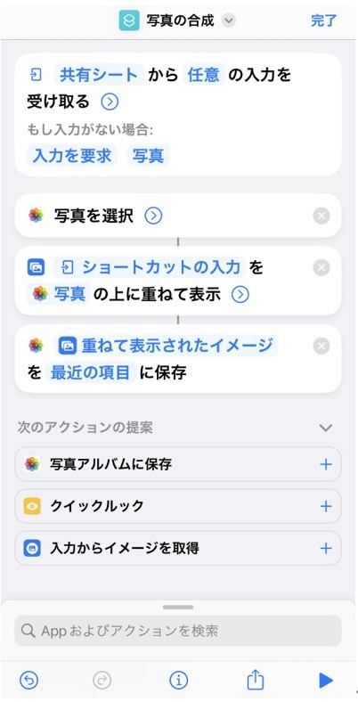 「イメージを重ねて表示」の画面に戻り、アクション検索欄から「写真アルバムの保存」を検索して表示します。