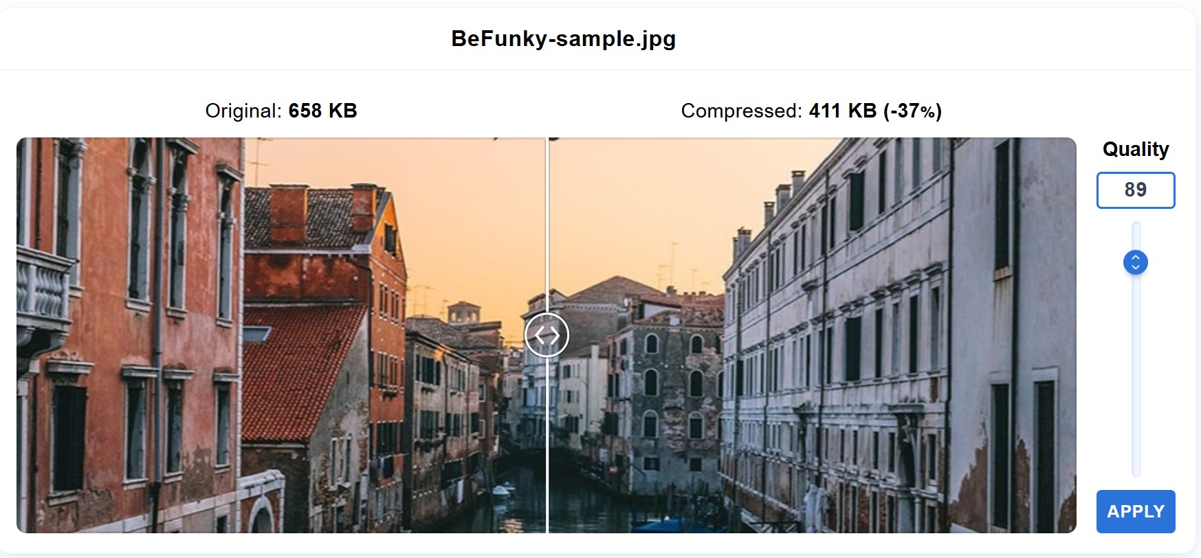After successfully uploading the image, Optimizilla will give you the recommended compressed image. If you are still not satisfied with the size, you can see a before-and-after comparison by adjusting the quality of your image. It is obvious that the size of the Original is 658kb. But it has changed to 411kb when compressed by the tool. Meanwhile, it is easy to see the clarity of the compressed one with the almost intact quality.