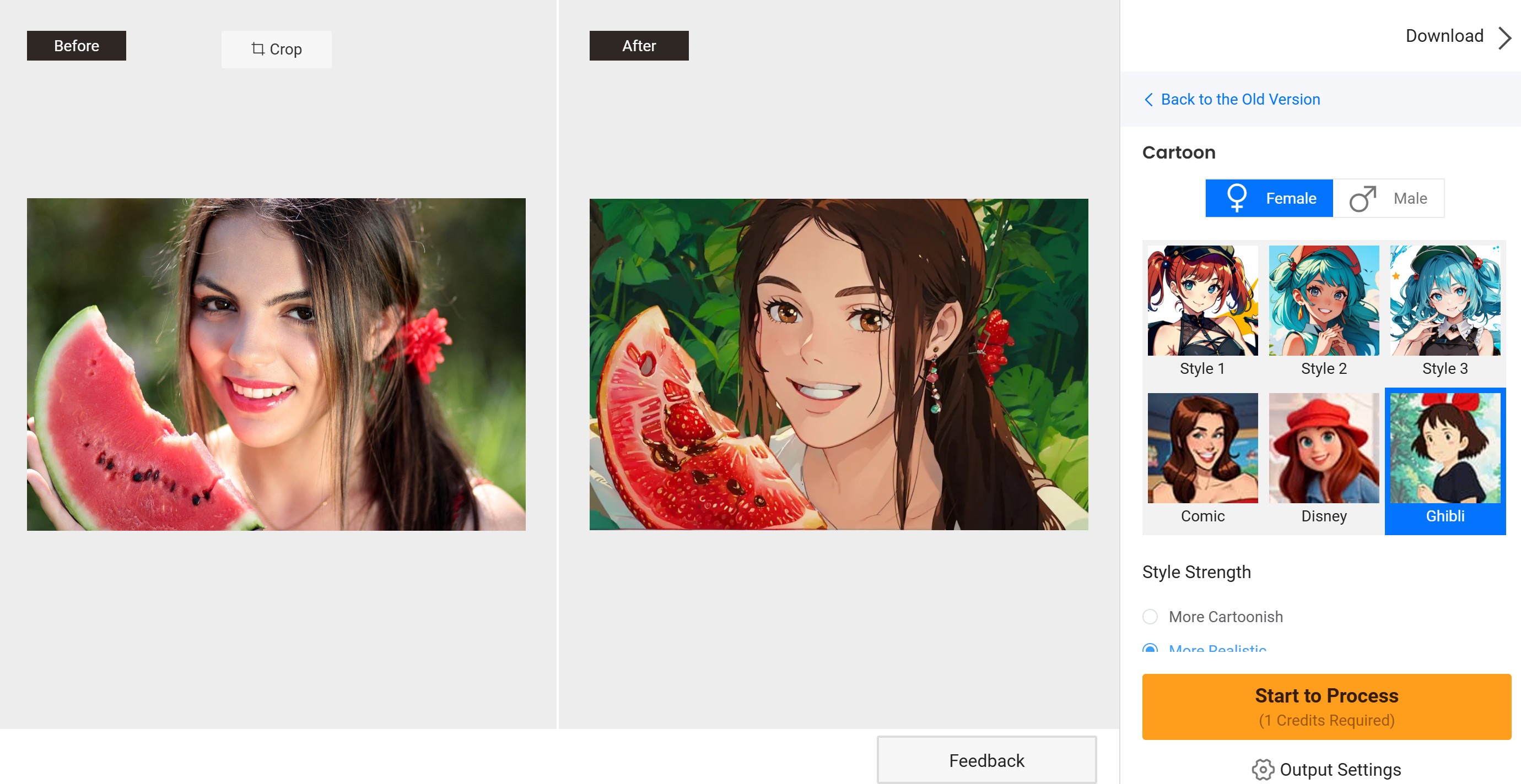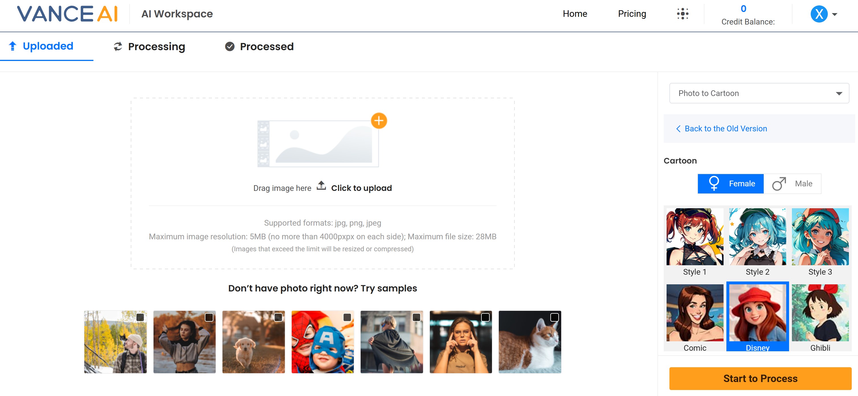 Step2: Select it and click "start to process" to cartoon yourself online. Or you may directly go to VansPortrait Workspace to upload your image and enjoy other features, including anime, sketch and cartoon.