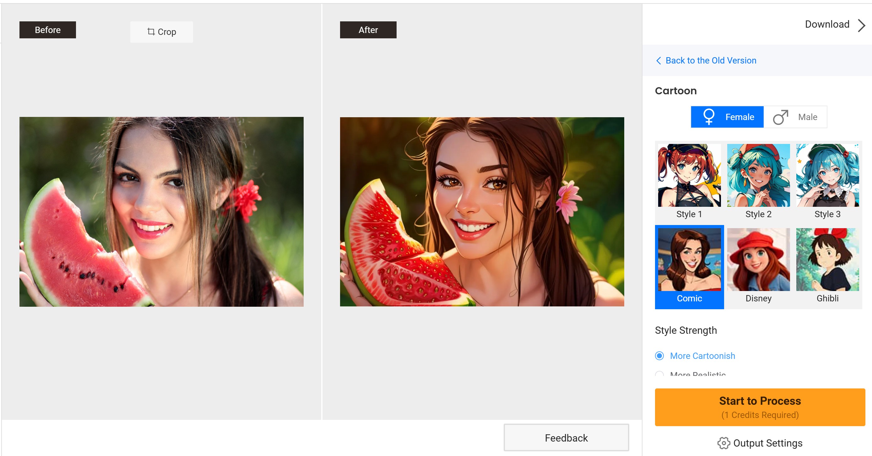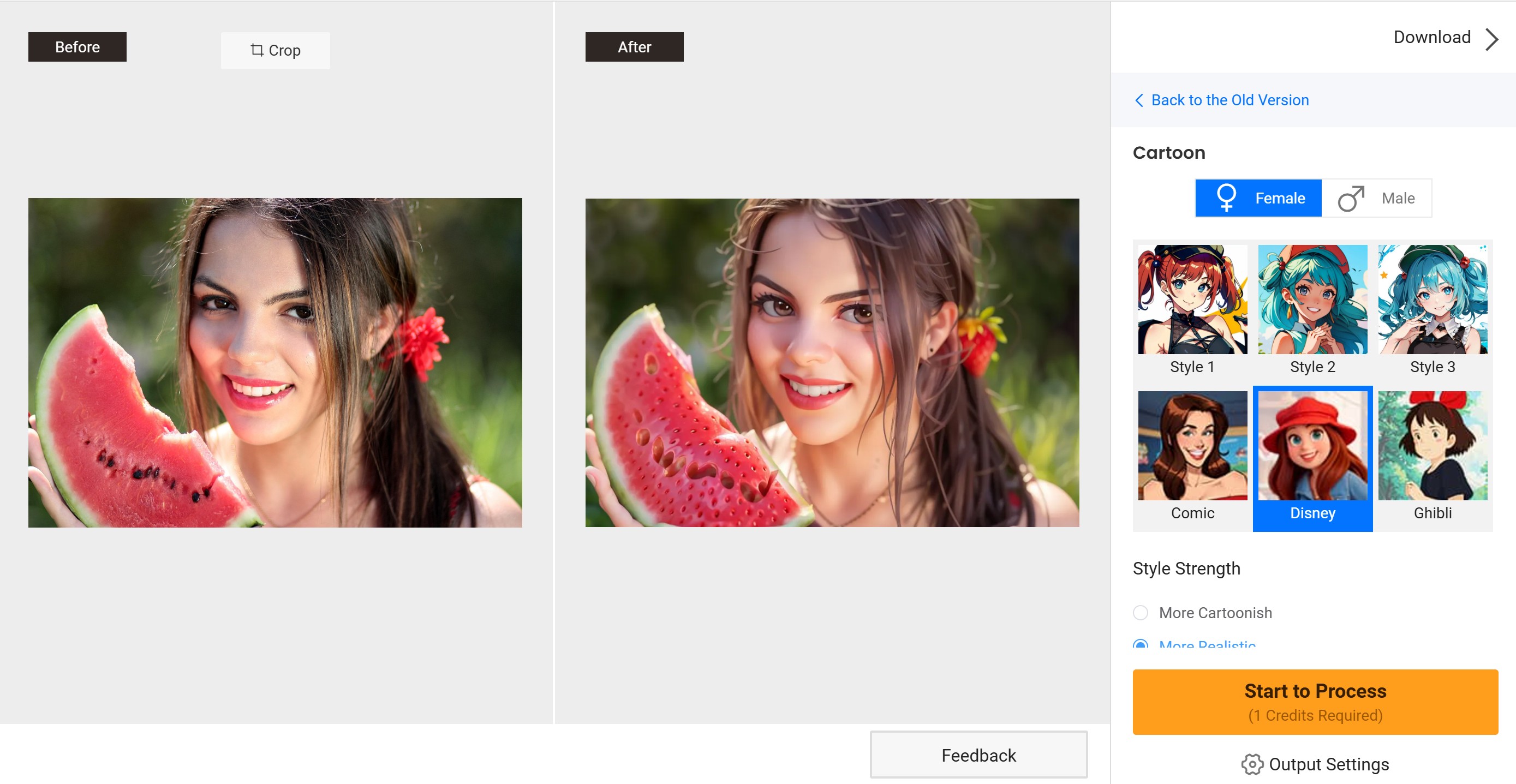 Step3: Start to cartoon and download the finished cartoon image. Apart from that, there comes some fancy AI Portrait Generator, making fancy selfies at a fast speed. Get to know more about it.