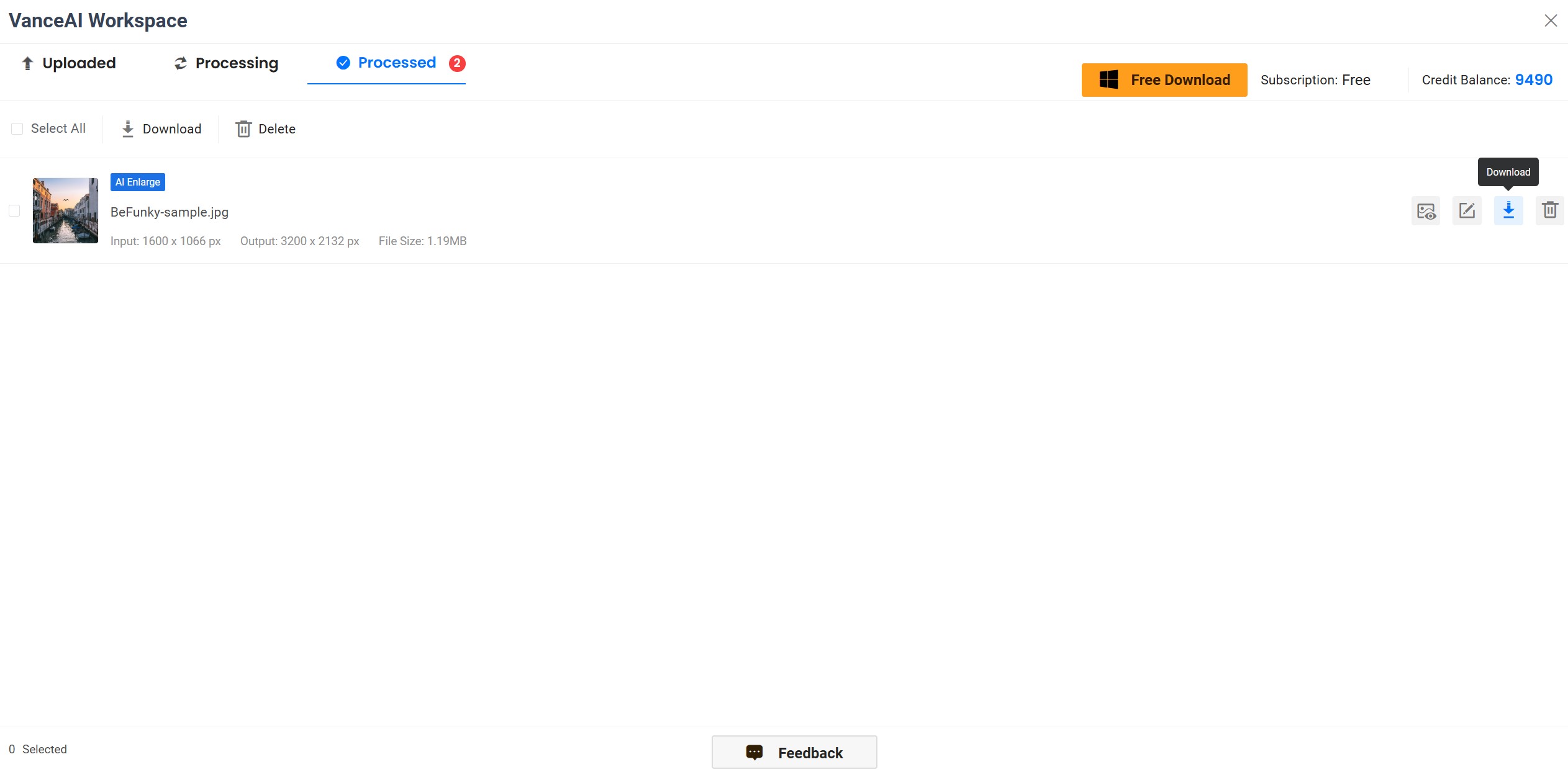 Click the “Processed Images” to find your image. You could click the download icon to save the image. You may also preview the image first if you like. And if you have any questions or suggestion, please send to the "Feedback" button!